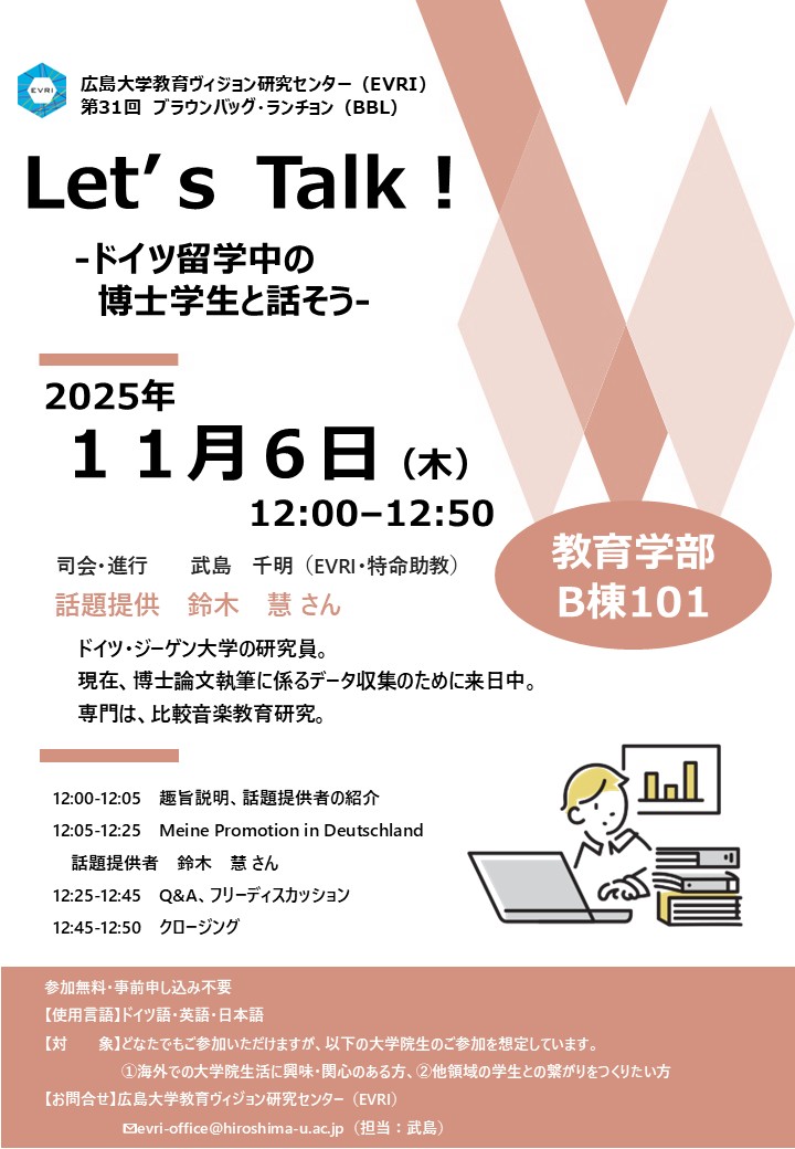 広島大学大学院人間社会科学研究科「教育ヴィジョン研究センター(EVRI)」は,2025年11月6日(木)にブラウンバッグランチョン「Let’s Talk!-ドイツ留学中の博士学生と話そう-」を開催いたしました。会には,ドイツ教育や音楽教育に関心をもつ7名が参加しました。