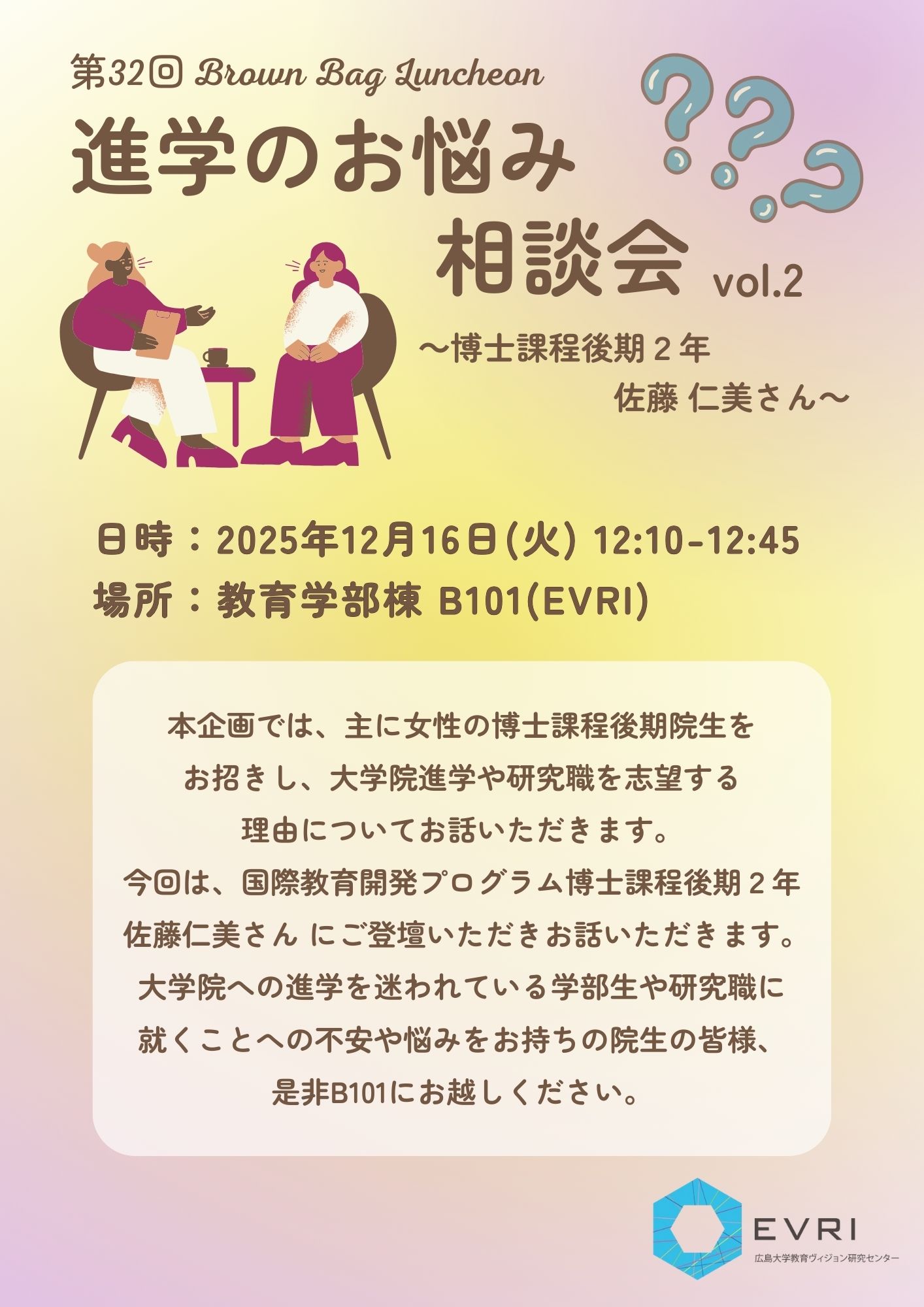広島大学大学院人間社会科学研究科「教育ヴィジョン研究センター(EVRI)」は,2025年12月16日(火)にブランウンバッグランチョン「進学のお悩み相談会-博士課程後期2年佐藤仁美さん-」を開催いたしました。大学院生を中心に5名の皆さまにご参加いただきました。