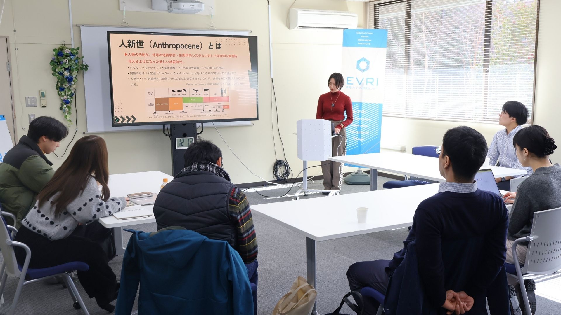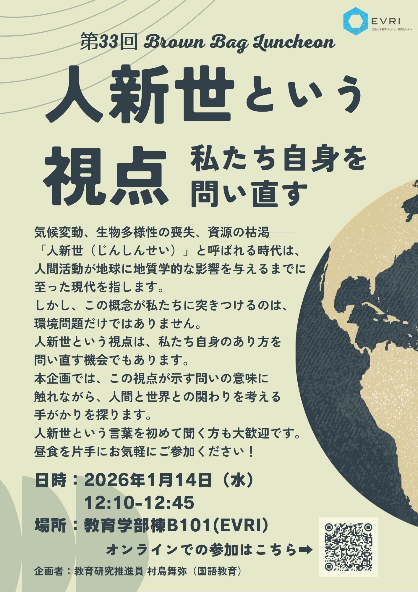 広島大学大学院人間社会科学研究科「教育ヴィジョン研究センター(EVRI)」は,2026年1月14日(水)にブラウンバッグランチョン「人新世という視点:私たち自身を問い直す」を開催いたしました。会には,対面・オンライン合わせて12名が参加しました。