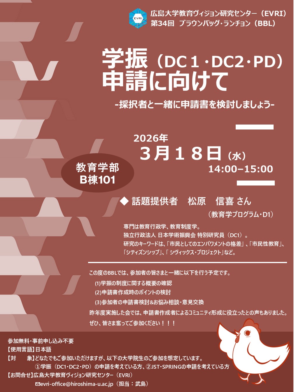 広島大学大学院人間社会科学研究科「教育ヴィジョン研究センター(EVRI)」は、2026年3月18日(水)に、ブラウンバッグランチョン第34回「学振(DC1・DC2・PD)申請に向けて—採択者と一緒に申請書を検討しましょう—」を開催しました。大学院生10名の皆様にご参加いただきました。
