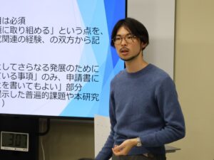 本企画は、昨年度(第2回BBL)に引き続き、日本学術振興会特別研究員の申請書を検討し、より良い申請書の執筆へと繋げていくことを目指して企画されました。この度の企画者である松原信喜さん(教育研究推進員)より、採択者の先輩方から引き継いだ内容や自身の経験を基に、制度概要において注目すべき点、申請書を執筆するにあたって重視してきた点が共有されました。