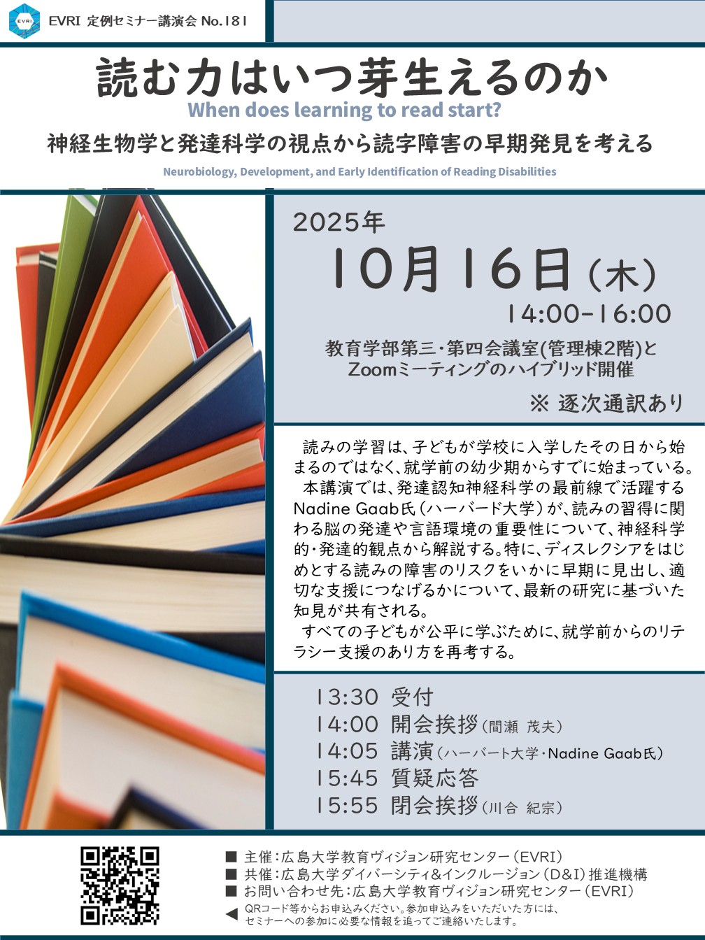 定例オンラインセミナー講演会No.181「When does learning to read start? Neurobiology, Development, and Early Identification of Reading Disabilities」 | 13:30–14:00 受付 14:00–14:05 開会・Nadine Gaab先生のご紹介(間瀬センター長) 14:05–15:45 Naine Gaab(ハーバード大学教育大学院 准教授)講演・逐次通訳付 15:45–15:55 Question and Answer 15:55–16:00 閉会(川合紀宗D&I推進機構マネジメント部門長) |
