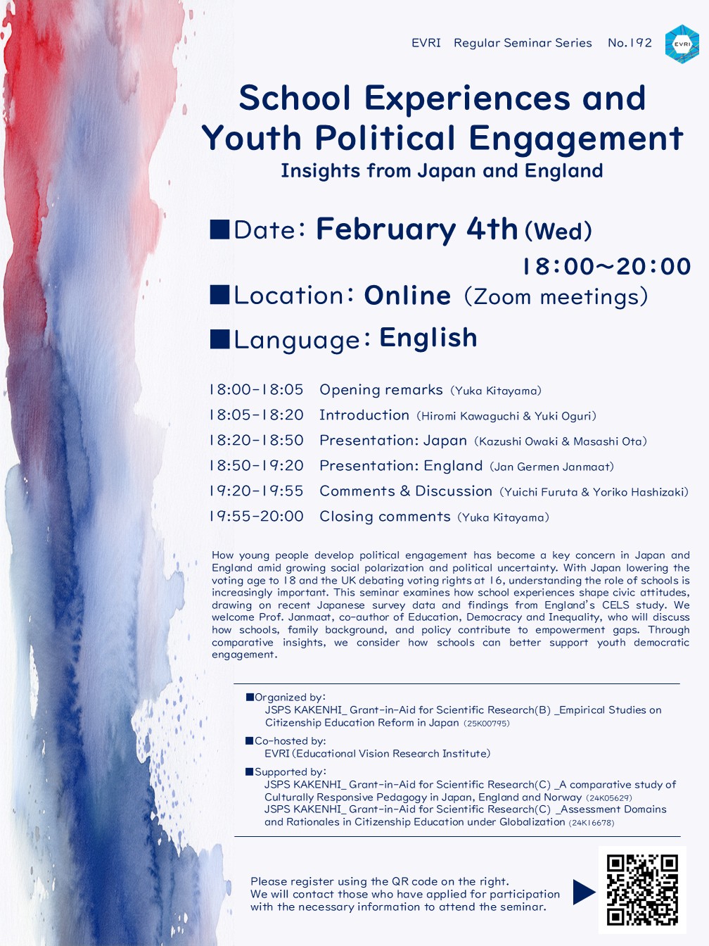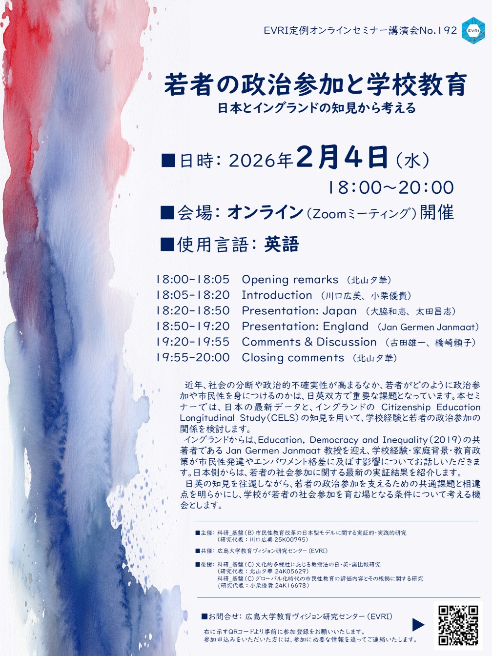 定例オンラインセミナー講演会No.192「若者の政治参加と学校教育―日本とイングランドの知見から考える― /School Experiences and Youth Political Engagement— Insights from Japan and England — 」」を開催します。(2026.2.4)