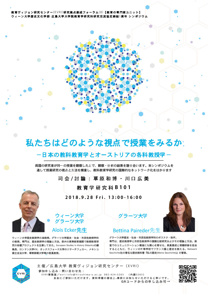 研究拠点創成フォーラム8「私たちはどのような視点で授業をみるか:日本の教科教育学とオーストラリアの各科教授学」 | 【講師】 Alois Ecker(ウィーン大学・グラーツ大学) Bettina Paireder(グラーツ大学) 草原和博(広島大学) 川口広美(広島大学) |