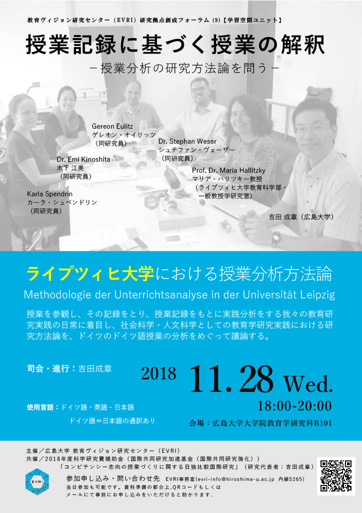 研究拠点創成フォーラム9「授業記録に基づく授業の解釈ー授業分析の研究方法論を問うー」 | 講師 Maria Hallitzky(ライプツィヒ大学) 木下江美(ライプツィヒ大学) Stephan Weser(ライプツィヒ大学) Gereon Eulitz(ライプツィヒ大学) Karla Spendrin(ライプツィヒ大学)司会・進行 吉田成章(広島大学) |