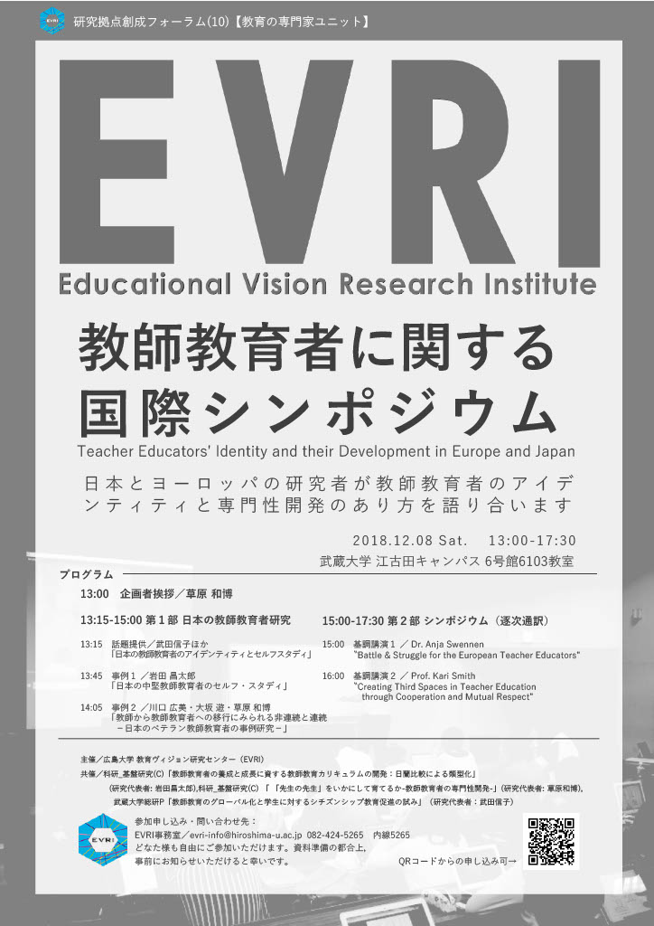 研究拠点創成フォーラム10「教師教育者に関する国際シンポジウム」 | 【講師】 Anja Swennen(アムステルダム自由大学) Kari Smith(ノルウェー工科大学) 武田信子(武蔵大学) 岩田昌太郎(広島大学) 川口広美(広島大学) 草原和博(広島大学) 大坂遊(徳山大学) |