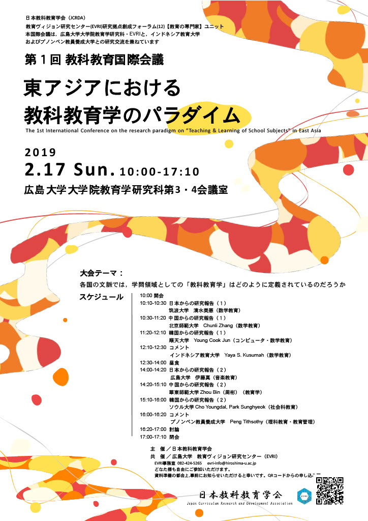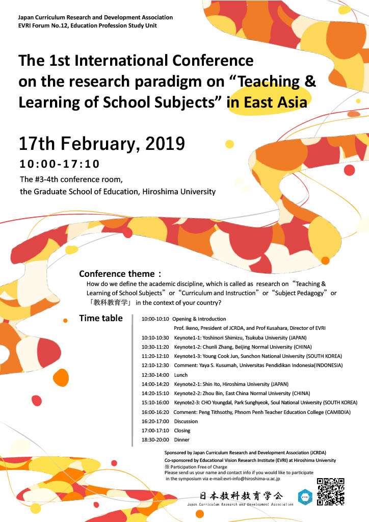 研究拠点創成フォーラム12「第1回教科教育国際会議:東アジアにおける教科教育学のパラダイム」 | 【講師】 Chunli Zhang(北京師範大学) Zhou Bin(華東師範大学) Young Cook Jun(順天大学) Cho Youngdal(ソウル大学) Park Sunghyeok(ソウル大学) Yaya S. Kusumah(インドネシア教育大学) PengTithsothy(プノンペン教員養成大学) 清水美憲(筑波大学) 伊藤真(広島大学) |