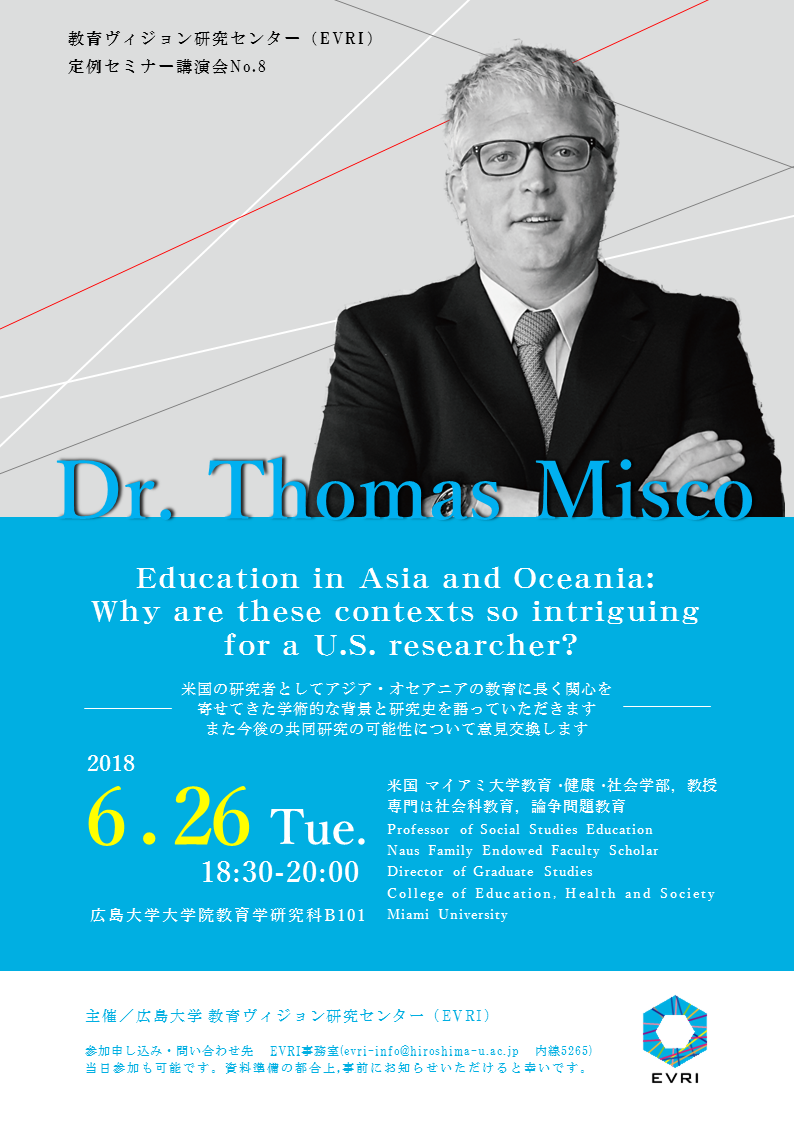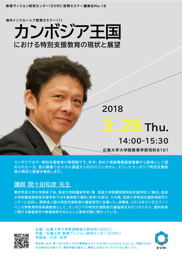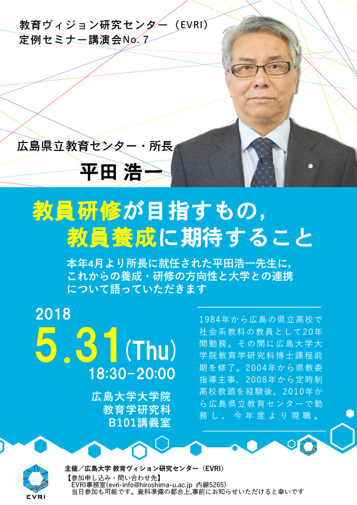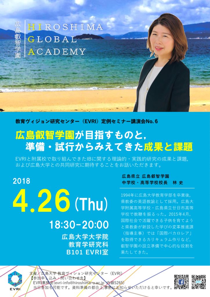 | 2018年4月26日(木)18:30-20:00(教育学部第一会議室) | 定例セミナー講演会No. 6 「広島叡智学園が目指すものと、準備・試行からみえてきた成果と課題」 |