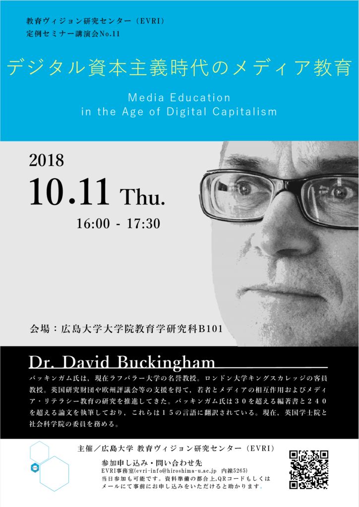 ・趣旨説明(丸山恭司・広島大学) ・Buckingham先生の紹介(時津啓・広島文化学園大学) ・講演「デジタル資本主義時代のメディア教育」(David Buckingham・ラフバラー大学名誉教授) |