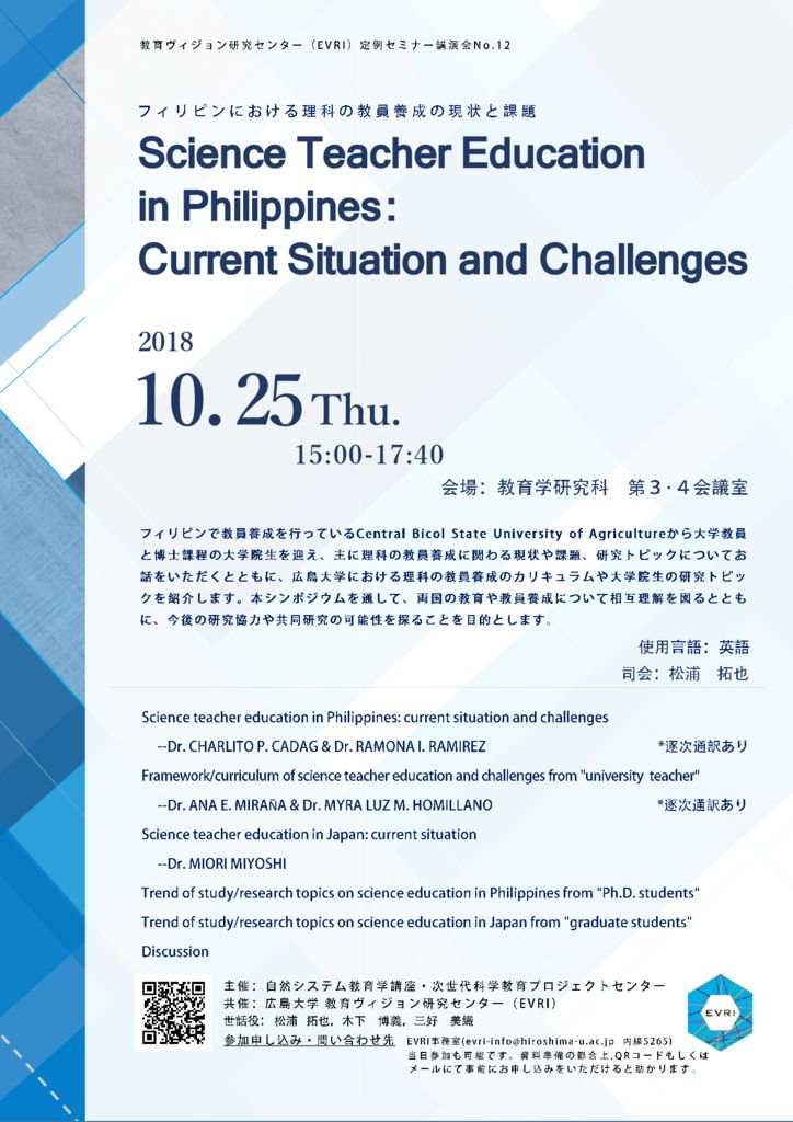 定例オンラインセミナー講演会No.12 「フィリピンにおける理科の教員養成の現状と課題」 |