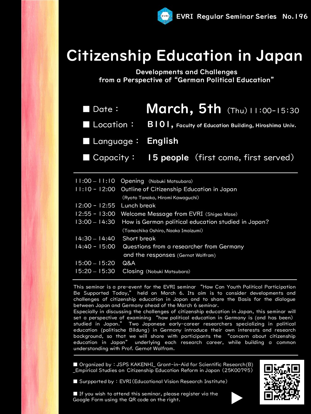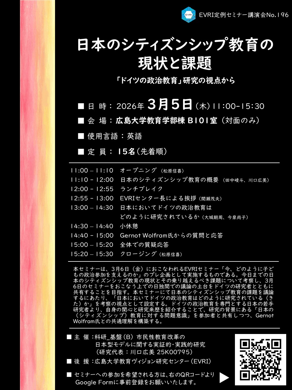 定例オンラインセミナー講演会No.196「日本のシティズンシップ教育の現状と課題―「ドイツの政治教育」研究の視点からー/Citizenship Education in Japan: Developments and Challenges from a Perspective of “German Political Education”」を開催します。(2026.3.5)