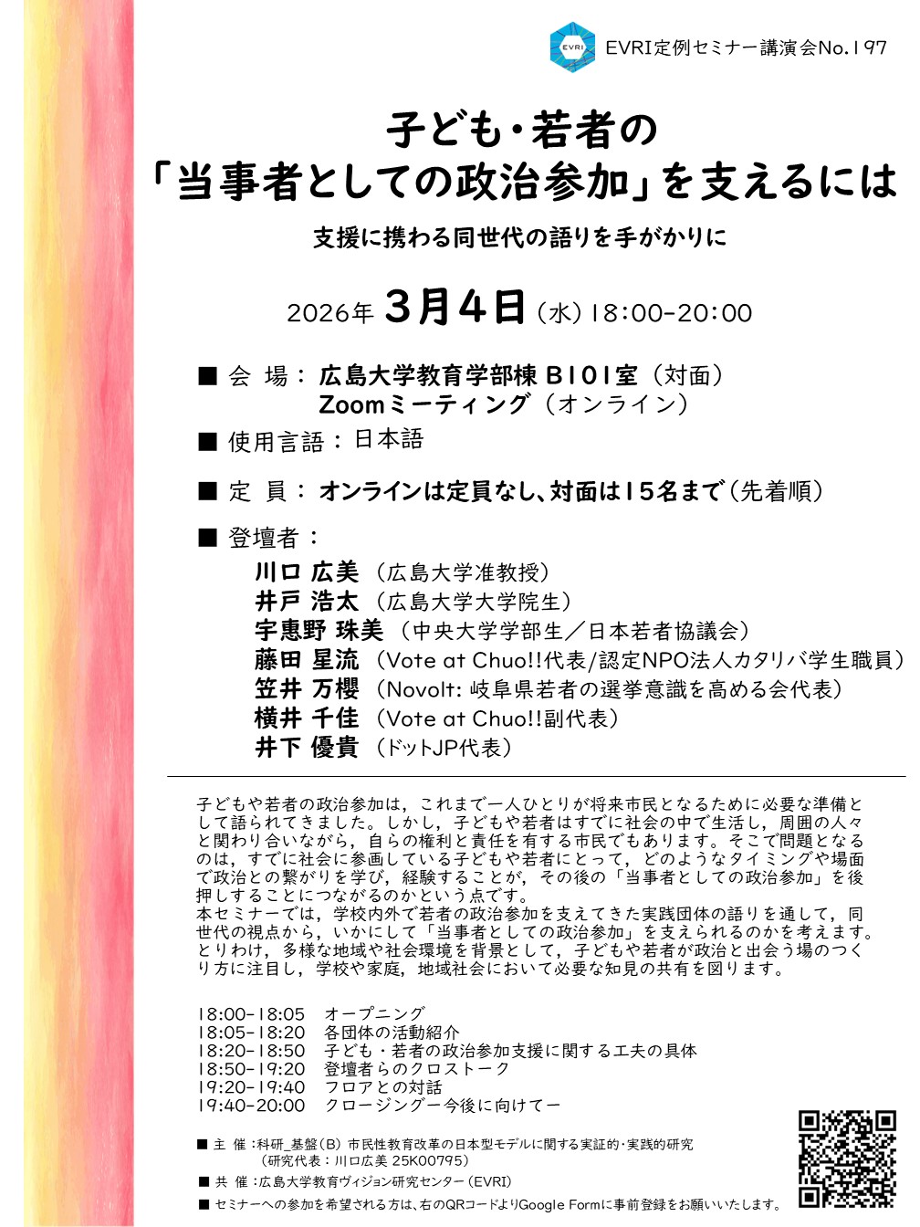 定例オンラインセミナー講演会No.197「子ども・若者の「当事者としての政治参加」を支えるには――支援に携わる同世代の語りを手がかりに――」を開催します(2026.03.04)