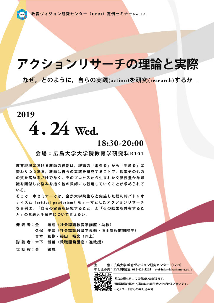 | 2019年4月24日(水) 18:30-20:00広島大学教育学研究科B101 (EVRI室) |