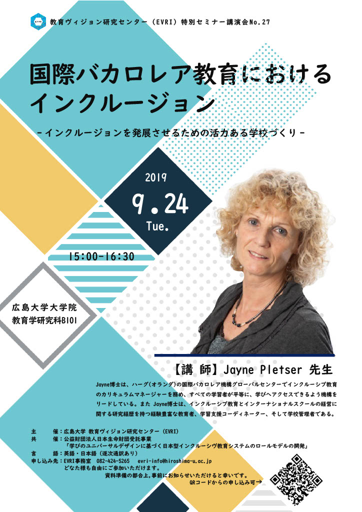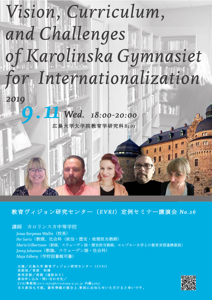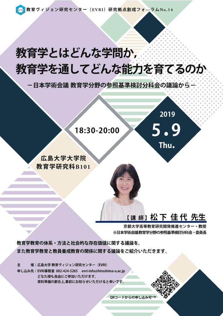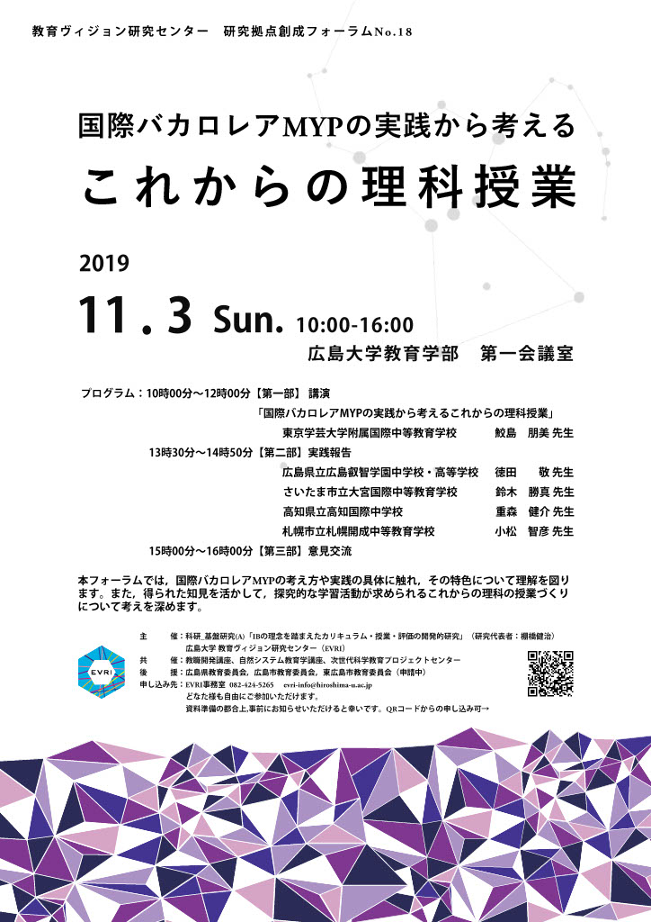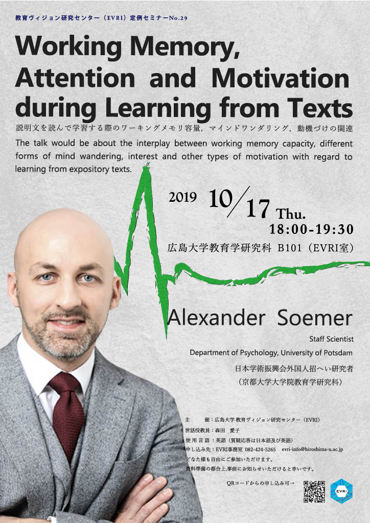 | 2019年10月17日(木) 18:00-19:30 広島大学教育学研究科B101 (EVRI室) |