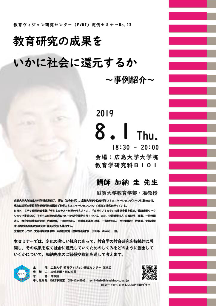 | 2019年8月1日(木) 18:30-20:00 広島大学教育学研究科B101 (EVRI室) |