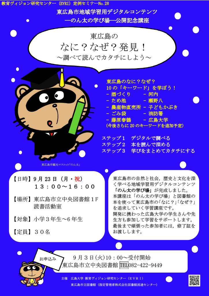 | 2019年9月11日(水) 18:00-20:00 広島大学教育学研究科B101 (EVRI室) |