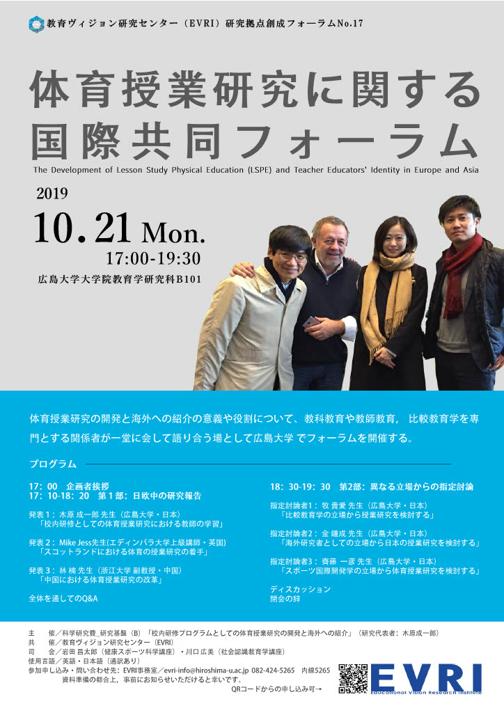 研究拠点創成フォーラムNo.17「体育授業研究に関する国際共同フォーラム:The development of Lesson Study Physical Education(LSPE) and Teacher Educator’s Identity in Europe and Asisa」 |