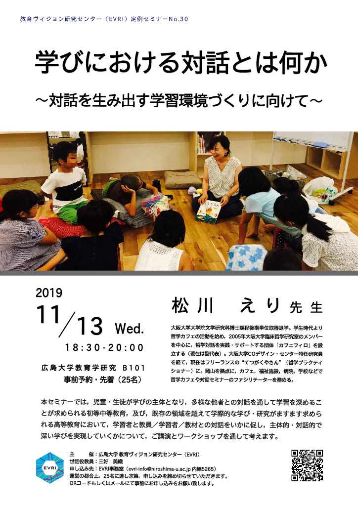 | 2019年11月13日(水) 18:30-20:00 広島大学教育学研究科B101 (EVRI室) |