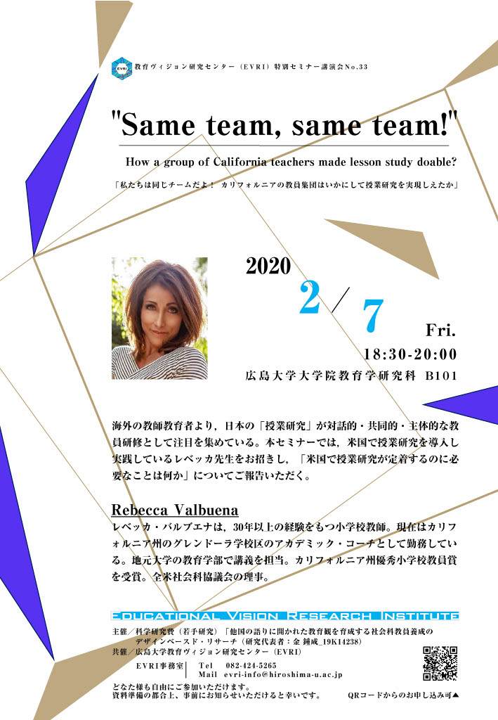 第33回定例セミナー「”Same team, same team!”: How a group of California teachers made lesson study doable?(私たちは同じチームだよ!カリフォルニアの教員集団はいかにして授業研究を実現しえたか?)」 | Rebecca Valbuena (カリフォルニア州グレンドーラ学校区 アカデミック・コーチ) |