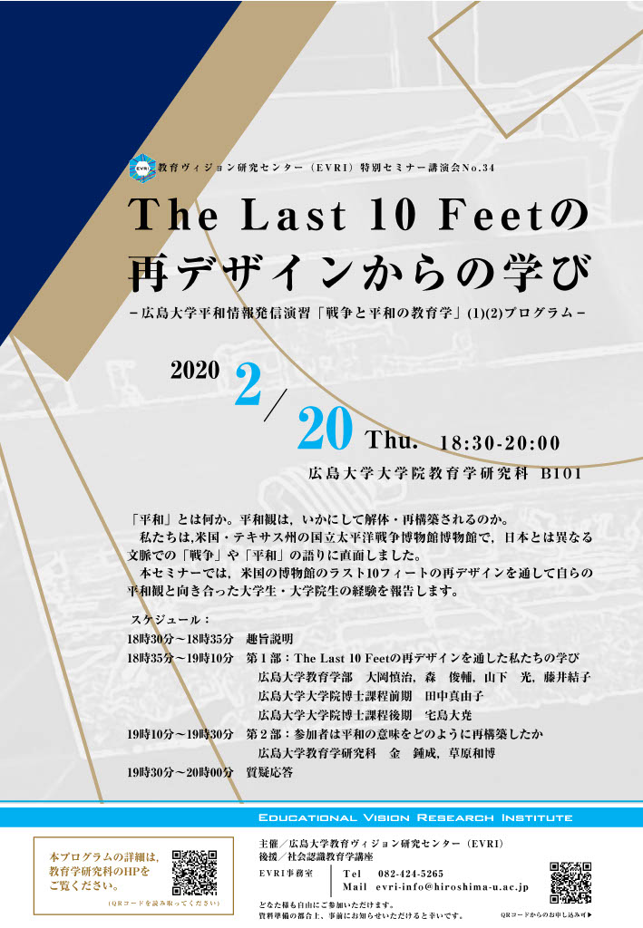 第34回定例セミナー「The Last 10 Feetの再デザインからの学び-広島大学平和情報発信演習『戦争と平和の教育学』(1)(2)プログラム-」 | 大岡慎治・森俊輔・山下光・藤井結子 (広島大学教育学部) 田中真由子 (広島大学大学院教育学研究科博士課程前期) 宅島大尭 (広島大学大学院教育学研究科博士課程後期) 金鍾成先生・草原和博先生 (広島大学大学院教育学研究科) |