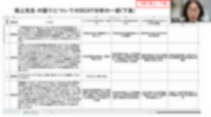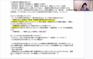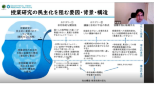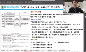 導入パートでは,大学院科目の振り返りとして,本講座のスタッフである小笠原教育研究推進員より感想が共有されました。小笠原氏からは,大学や学術コミュニティを問うような内容や,民主的な授業研究においてどのような位置付けで教師教育者はどのように関与することができるのかについての対話が印象的であったことが述べられました。また,前期授業科目全体を通して,教師教育者をめぐる議論を行う中で,教師教育者の奥深さを知ることができる機会であったことが共有されました。