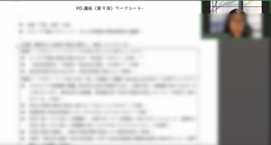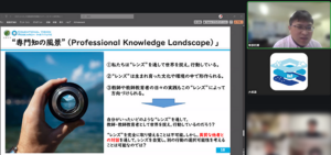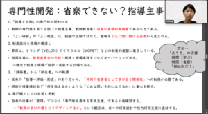 「導入パート」では,近況報告や大学院科目に関する感想などが参加者間で共有されました。草原教授の担当する大学院科目「教職課程・現職研修カリキュラムデザイン基礎研究」に参加している受講者のお話を伺ってみると,教師教育者として活躍されている(過去のPD講座修了生である)大学教員の葛藤に関する経験を踏まえ,自身の経験と概念を擦り合わせることができているという語りが共有されました。この点について,草原教授はPD講座を通じ,概念や現象についての理論的枠組みを策定する,様々な概念を学び,自身の経験や日常的な現象について説明できる喜び,言葉に触れ合う機会となることを期待している旨が説明されました。