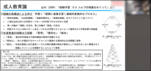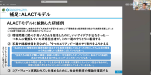 まず,「成人教育論」をテーマに,受講者から発表が行われました。発表では,経験学習サイクルや経験学習プロセスを基軸として,成人学習者の経験をどのように捉えるのか,成人の学習を促すためにはどのようなことが求められるのかについて,受講者自身の経験を踏まえて論じられました。受講者の発表を受け,大坂教育研究推進員は,理想的なリフレクションのプロセスを示したALACTモデルを提示しました。大坂氏からは,教師の成長には,教育実践を行ったのち振り返りが行われることが不可欠であること,また実践者の経験的な知見と学術的な知見の擦り合わしていくことの重要性が語られました。