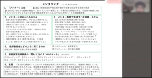 演習パート①では,受講者が課題文献に関する学びを共有しました。あらかじめ課題として提示された教師教育に関する3つの論文(赤尾編2004:141-169,濱本ほか2019,中川2022)と1本の動画(草原教授作成の広島大学内の新任教員研修用教材 ※非公開),その他関連する文献を参照し,「成人教育論」「メンタリング」という二つの観点から論点や学びをまとめた成果が受講者から共有されました。