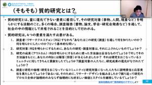 今回の講座では,チャットでも校内研修を題材とした活発な議論が見られました。共同研究グループは確定したものの,グループ内での概念や課題意識のズレ,RQの精緻化など,依然として課題は残っています。今後は各グループで夏休み期間を利用して打ち合わせを重ね,次回8月30日の講習での有意義な報告を目指していきます。