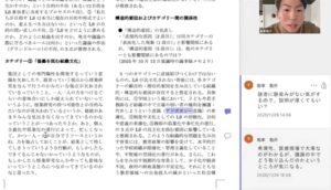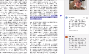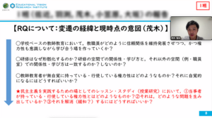 第一グループは,「民主主義を実践するための場としてのレッスン・スタディと権力性の関係性」に着目しています。具体的には,協議を繰り返す中で,「レッスン・スタディを実施している当事者が持つ,あるいは行使している権力性の実態はどのようなものなのか」,「それはどのような問題を生み出しているのか」,「問題を解消するにはどうすれば良いのか」の3点を現時点のリサーチクエスチョン(RQ)として設定した経緯が報告されました。進捗報告では,協働的セルフスタディの手法の検討や,Kim 2021を主要参考論文に据える点などが共有されました。そして,今後の課題として3点が示されました。これまでの権力性や権威性に関する議論を踏まえ,①権力性・権威性という概念の整理,②セルフスタディを通した,先行研究(文献)を拠り所とした自身の研修経験の省察,③権力性の位置付け直しです。この報告について,草原教授は2つの点を提案しました。1つは,「概念整理と並行して,自身の実体験に基づく感覚的な権力性の存在を記述してはどうか」です。もう1つは,「有益な権力性は維持し,そうでないものは解消するという視点で,様々な職業的立場から権力性を整理することも有効ではないか」という提案がありました。