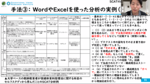まず,大坂氏が,オープンコーディングの基本的な考え方と,WordやExcelを用いた具体的な分析手順を紹介しました。続いて,松本氏が,第二グループも採用している分析手法「SCAT」について解説しました。SCATは,①注目すべき語句の抽出,②語句の言い換え,③テキスト外の概念の発見,④テーマ構成概念の生成,という4つのステップで分析を進める手法であり,その具体的な手順や留意点について情報提供が行われました。解説を受け,草原氏からは,特にステップ③「テキスト外の概念」を見出すには先行研究の知見が不可欠であり,研究の要となる部分である点が補足されました。また,研究の透明性・妥当性を担保する上で,分析プロセスを記録・管理する「データマネジメントプラン」の重要性についても情報提供が行われました。