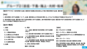 第二グループでは,「校内研修の企画者と受講者が持つ認識の差異」に着目し,その差異を明らかにすることを研究目的としています。この目的を達成するため,「企画者は研修にどのような認識を持っているのか」,「企画者と参加者の認識にはどのような差異があるのか」という2つのRQを設定しました。進捗として,インタビューガイドと質問紙の作成が進んでおり,次回の講座までにデータ収集を行う予定であることが共有されました。また,草原和博教授からは,この研究の方向性について,草原教授から以下のコメントがありました。まず,草原氏は,「校内研修をPLC(Professional Learning Community)として機能させることが,研修をより良くする」という仮説を指摘しました。その上で,企画者と参加者の認識の差異を明らかにすることが重要になる。なぜなら,両者の認識のズレが大きければ大きいほど,その研修はPLCとして十分に機能していないと考えられるからです。そのため,企画者と参加者の認識を一致させていくことがPLCを成立させる重要な条件である,という問題意識をより強調してはどうか,と提案がなされました。