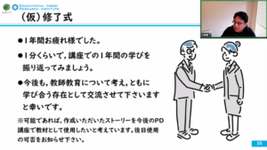 今後は,3月末を目処に修了証明書が発行される予定です。また,修了生同士が継続的に交流できるメーリングリストの作成や,今回作成されたストーリーを今後の教材として活用することなどが案内され,第10回PD講座および今年度の全プログラムが終了しました。