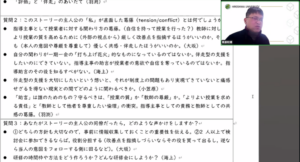 「演習パート①」では,論文執筆を通して形成された関係性を基盤に,自身のアイデンティティや規範,価値観をメタ認知し,再構築するための活動として「ストーリー法」が導入されました。草原教授より趣旨説明があり,人は自身の価値観や信念といった「レンズ」を通して世界を見ているというメタファーが紹介されました。レンズを完全に捨てることはできないものの,葛藤の物語(ストーリー)を読み書きし,話し合うことを通して,その特性を自覚(メタ認知)し,別の見方や行動の可能性を探ることは可能であると説明されました。